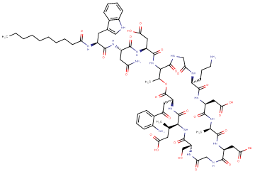 化学全称2,2'-((3S,6S,9R,15S,18R,21S,24S)-30-((S)-2-((S)-4-amino-2-((S)-2-decanamido-3-(1H-indol-3-yl)propanamido)-4-oxobutanamido)-3-carboxypropanamido)-3-(2-(2-aminophenyl)-2-oxoethyl)-24-(3-aminopropyl)-6-((R)-1-carboxypropan-2-yl)-9-(hydroxymethyl)-18,31-dimethyl-2,5,8,11,14,17,20,23,26,29-decaoxo-1-oxa-4,7,10,13,16,19,22,25,28-nonaazacyclohentriacontane-15,21-diyl)diacetic acid