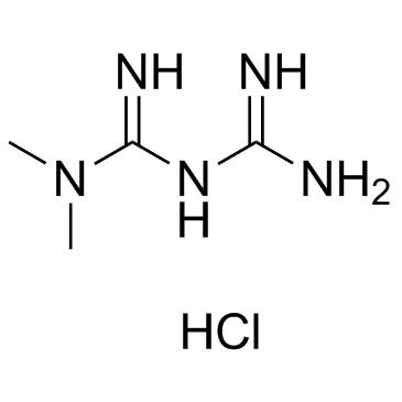 盐酸二甲双胍是一种广泛使用的抗糖尿病化合物,Metformin hydrochloride (1,1-Dimethylbiguanide hydrochloride) 抑制肝脏中的线粒体呼吸链,导致 AMPK 活化,增强胰岛素敏感性,可用于 2 型糖尿病的研究。Metformin hydrochloride 可以透过血脑屏障,诱导自噬 (autophagy)。