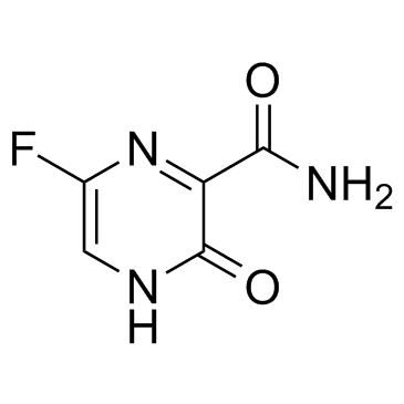 Favipiravir (T705) 是一种吡嗪甲酰胺衍生物,对流感病毒、西尼罗河病毒、黄热病病毒、口蹄疫病毒以及其他黄病毒、沙粒病毒、布尼亚病毒和甲病毒具有活性。