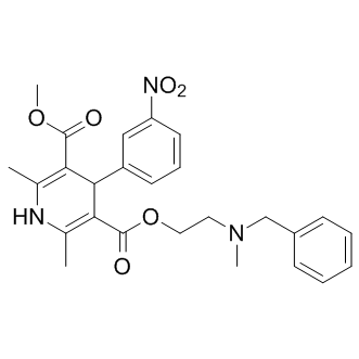 体外实验Nicardipine (0.1-10 μM; 24-48 h) reduces viability and proliferation of vascular smooth muscle cells (VSMCs) and inhibits their ability to migrate. Cell Viability Assay Cell Line:VSMCs were isolated from New Zealand rabbit aortic preparations Concentration:0.1 μM, 1 μM, 3 μM, 10 μM Incubation Time:24-48 hours Result:Treatment reduced significantly cell viability and inhibited VSMCs proliferation in the presence of 10% FBS in a dose-dependent way, from 205.4±17.5% to 176.6±17%, 160.6±5.7%, 150.4±11.2%, 61.22±7.83% after 0.1 μM, 1 μM, 3 μM, 10 μM treatment, respectively.
