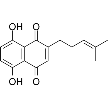 Deoxyshikonin 从软紫草 Arnebia euchroma 中分离,具有抗肿瘤活性。Deoxyshikonin增加 HMVEC-dLy 中 VEGF-C 和 VEGF-A mRNA 的表达,促进 HIF-1α 和 HIF-1β 亚基相互作用,并与 HIF 特异性 DNA 序列结合。Deoxyshikonin 在体外具有促血管生成作用。Deoxyshikonin 显示出显着的协同抗微生物活性, S. pneumonia (MIC =17μg/mL),也显示出对 MRSA 的显着抑制活性。