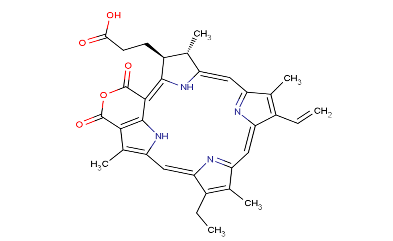 SMILESCCC1=C(C2=NC1=CC3=C(C4=C(N3)C(=C5[C@H]([C@@H](C(=CC6=NC(=C2)C(=C6C)C=C)N5)C)CCC(=O)O)C(=O)OC4=O)C)C