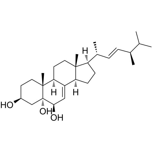 产品描述Cerevisterol is a cytotoxic steroid, can inhibit the activity of DNA polymerase alpha. It can stimulate NGF-mediated neurite outgrowth on PC12 cells. Cerevisterol acts as a natural agent for treating inflammatory diseases by targeting an MAPK, NF-κB, AP-1, and Nrf2-mediated HO-1 signaling cascade.(In Vitro):Cerevisterol suppresses the LPS-induced production of NO and PGE2, which is a plausible mechanism for this effect is by reducing the expression of iNOS and COX-2. Cerevisterol also decreases the expression of pro-inflammatory cytokines, such as TNF-α, IL-6, and IL-1β. Cerevisterol halted the nuclear translocation of NF-κB by blocking the phosphorylation of inhibitory protein κBα (IκBα) and suppressing NF-κB transactivation. The mitogen-activated protein kinases (MAPK) signaling pathways are also suppressed. Cerevisterol treatment also inhibited the transactivation of AP-1 and the phosphorylation of c-Fos. Furthermore, Cerevisterol could induce the nuclear translocation of nuclear factor erythroid 2-related factor 2 (Nrf2) by down-regulating Kelch-like ECH-associated protein 1 (Keap-1) and up-regulating hemeoxygenases-1 (HO-1) expression.