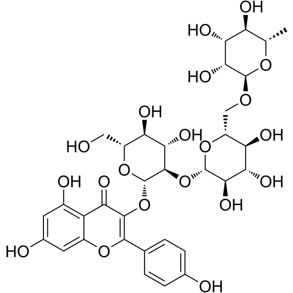 体外实验Kaempferol-3-O-α-L-rhamnopyranosyl-(1→6)-β-D-glucopyranosyl-(1→2)-β-D-glucopyranoside exhibits inhibitory activity against TPA-induced free radical formation in a HL-60 cell culture system and shows free radical scavenging activity in the DPPH assay. The IC50 values are 26.6 μM and 17.6 μM in DPPH and cytochrome-c reduction assays.