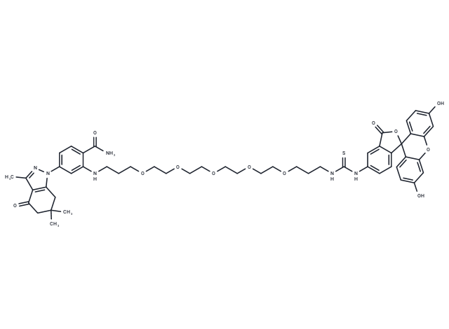HS-27,一种荧光 Hsp90 抑制剂,检测完整组织标本表面 Hsp90 的表达。HS-27 由 SNX-5422 的核心元素组成,SNX-5422 是一种 Hsp90 抑制剂,通过 PEG 连接物与荧光素衍生物 (异硫氰酸荧光素或 FITC) 连接,后者与外周表达的 Hsp90 结合。HS-27 在乳腺癌的观察与研究中有潜在的应用。
