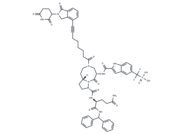 SMILESC(N[C@H](C(NC(C1=CC=CC=C1)C2=CC=CC=C2)=O)CCC(N)=O)(=O)[C@H]3N4[C@](CC3)(CCN(C(CCCCCC#CC5=C6C(C(=O)N(C6)C7C(=O)NC(=O)CC7)=CC=C5)=O)C[C@H](NC(=O)C8=CC=9C(N8)=CC=C(C(P(=O)(O)O)(F)F)C9)C4=O)[H]
