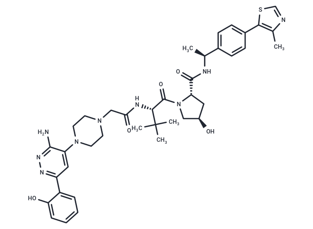 SMILESC[C@H](NC(=O)[C@@H]1C[C@@H](O)CN1C(=O)[C@@H](NC(=O)CN1CCN(CC1)c1cc(nnc1N)-c1ccccc1O)C(C)(C)C)c1ccc(cc1)-c1scnc1C