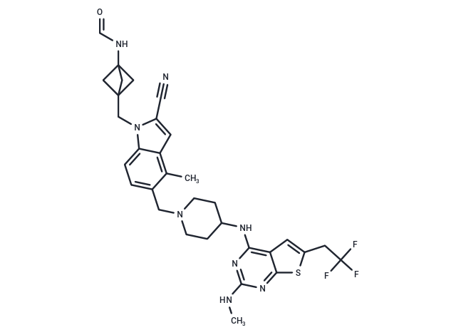 SMILESCNc1nc(NC2CCN(Cc3ccc4n(CC56CC(C5)(C6)NC=O)c(cc4c3C)C#N)CC2)c2cc(CC(F)(F)F)sc2n1