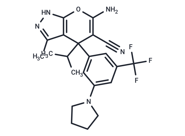 SMILESCC(C)C1(c2c(C)n[nH]c2OC(N)=C1C#N)c1cc(cc(c1)C(F)(F)F)N1CCCC1