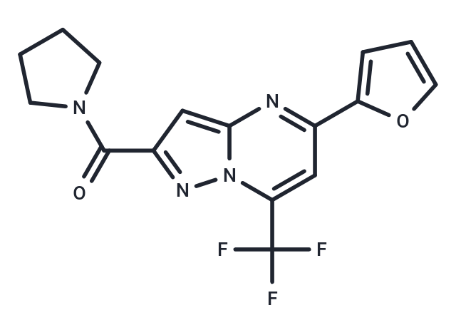 SMILESC(F)(F)(F)C=1N2C(N=C(C1)C3=CC=CO3)=CC(C(=O)N4CCCC4)=N2