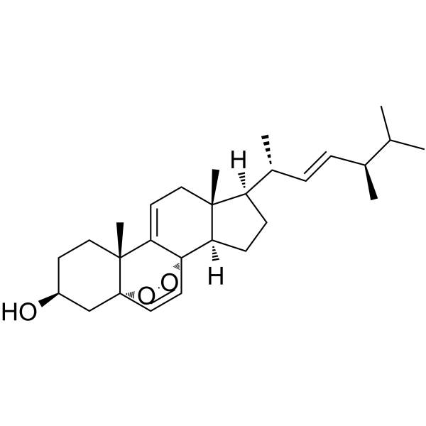体外实验5,8-Epidioxyergosta-6,9(11),22-trien-3-ol (9,11-Dehydroergosterol peroxide) is an effective inhibitor of HL60 leukemia cell growth and apoptosis-inducer.Apoptosis induced by 5,8-Epidioxyergosta-6,9(11),22-trien-3-ol from Ganoderma Lucidum mycelium in human malignant melanoma cells is Mcl?1 dependent.