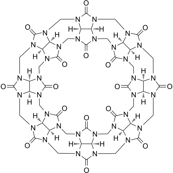 体外实验Cucurbituril (0~20 μM; 48 hours; CHO-K1 cells) makes the relative cell viability dropped marginally to 86%.Cucurbituril indeed selectively induces the heterodimerization of MV–eYFP with Np–eCFP. Cucurbituril-induced high energy transfer between the proteins is only observed in the presence of all three supramolecular components, allowing the formation of the ternary complex. In the presence of Cucurbituril, the unspecific protein assembly induced by the methylviologen is inhibited. The ternary system of Cucurbituril with methylviologen (MV) and naphthalene (NP) can also be successfully used for the formation of selective protein heterodimers of more hydrophobic proteins.The presence of Cucurbituril as a host molecule is required to prevent MV induced unspecific dimerization with hydrophobic protein surfaces. Cell Viability Assay Cell Line:CHO-K1 cells Concentration:0~20 μM Incubation Time:48 hours Result:At the highest investigated concentration of 20 μM after 48 h, the relative cell viability dropped marginally to 86%.