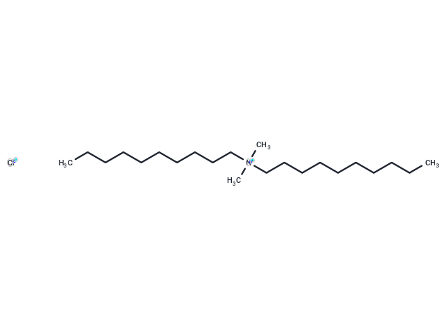 体外实验N-Decyl-N,N-dimethyldecan-1-aminium chloride (Didecyldimethylammonium chloride, DDAC) is a broad-spectrum bactericidal and fungicidal biocide that exhibits antimicrobial activity against several pathogens such as Staphylococcus aureus, Escherichia coli, Pseudomonas aeruginosa, Legionella pneumophilia, Stachybotrys chartarum and enveloped and non-enveloped viruses.