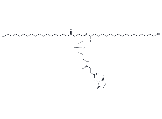 DSPE-NHS 是一种具有两个疏水性脂质尾巴的生物共轭磷脂分子。NHS 可以与蛋白或肽的 N 端反应,形成稳定的酰胺键。DSPE-NHS 是一种在水溶液中形成脂质双分子层的自组装试剂。DSPE-NHS 可用于制备脂质体作为活性分子纳米载体。