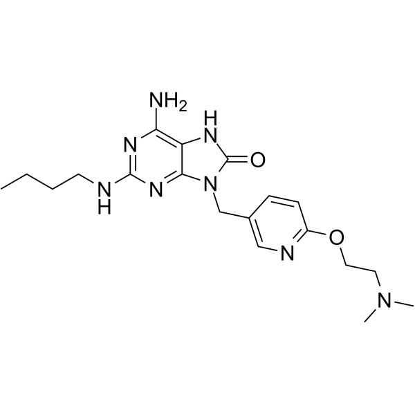 产品描述DSR-6434 has a strong antitumor effect. DSR-6434 is a potent and selective Toll-like receptor 7 (TLR7) agonist, with EC50s of 7.2 nM and 4.6 nM for human and mice TLR7, respectively.(In Vitro):To assess the specificity of DSR-6434 toward TLR7, an NF-κB-driven reporter assay is performed in HEK293 cells engineered to express either hTLR7, TLR8 or TLR9. In this assay, successful binding of DSR-6434 to the specific receptor leads to NF-κB activation. DSR-6434 is capable of stimulating reporter gene activity only in HEK293 cells expressing hTLR7 and not in HEK293 cells expressing the structurally similar hTLR8 or hTLR9.(In Vivo):In B6C3F1 mice, DSR-6434 (0.1-1 mg/kg; i.v.) significantly suppresses lung metastasis.