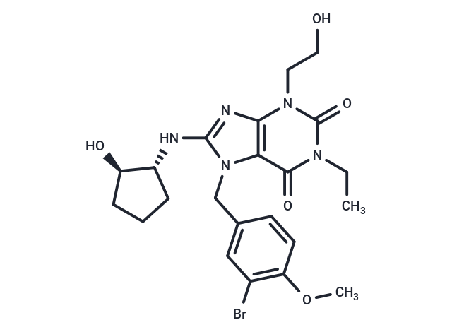 SMILESC(N1C2=C(N(CCO)C(=O)N(CC)C2=O)N=C1N[C@H]3[C@H](O)CCC3)C4=CC(Br)=C(OC)C=C4