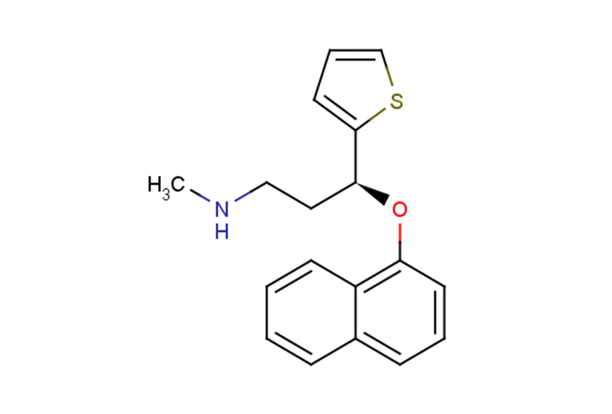 体外实验Duloxetine ((S)-Duloxetine) inhibits the reuptake of serotonin and norepinephrine in the central nervous system. Duloxetine is also considered a less potent inhibitor of dopamine reuptake. However, duloxetine has no significant affinity for dopaminergic, adrenergic, cholinergic, histaminergic, opioid, glutamate, and GABA receptors and can therefore be considered to be a selective reuptake inhibitor at the 5-HT and NA transporters. Duloxetine undergoes extensive metabolism, but the major circulating metabolites do not contribute significantly to the pharmacologic activity. Major depressive disorder is believed to be due in part to an increase in pro-inflammatory cytokines within the central nervous system. Antidepressants including ones with a similar mechanism of action as duloxetine, i.e. serotonin metabolism inhibition, cause a decrease in proinflammatory cytokine activity and an increase in anti-inflammatory cytokines; this mechanism may apply to duloxetine in its effect on depression but research on cytokines specific to duloxetine therapy is lacking. The analgesic properties of duloxetine in the treatment of diabetic neuropathy and central pain syndromes such as fibromyalgia are believed to be due to sodium ion channel blockade.