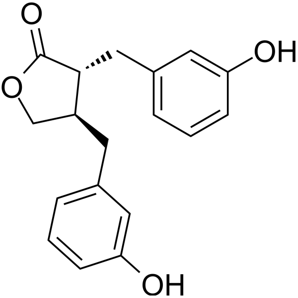 体外实验Enterolactone (25-75 μM; 48 hours) arrests the growth of MDA-MB-231 breast cancer cells in the ‘S’ phaseEnterolactone (25-75 μM; 15 hours) triggers apoptosis in MDA-MB-231 breast cancer cells via caspase-3 activation.Enterolactone inhibits TGF-β-induced migration of MDA-MB-231 breast cancer cells. Enterolactone inhibits TGF-β-induced invasion of MDA-MB-231 breast cancer cells through ECM. Enterolactone inhibits the TGF-β-induced EMT program in MDA-MB-231 breast cancer cells. Enterolactone reduces the formation of actin stress fibers by inhibiting the expression of CD44 and MAPK-p38. Enterolactone inhibits the ERK/NF-κB/Snail signaling pathway to revert TGF-β-induced EMT in MDA-MB-231 cells. Cell Viability Assay Cell Line:MDA-MB-231 cells Concentration:25, 50, 75 μM Incubation Time:48 hours Result:There was a non-significant increase (~24%) in the S phase population following treatment with 25 μM EL, whereas there were significant increases (~34% and ~39%) following treatment with 50 and 75 μM EL, respectively.