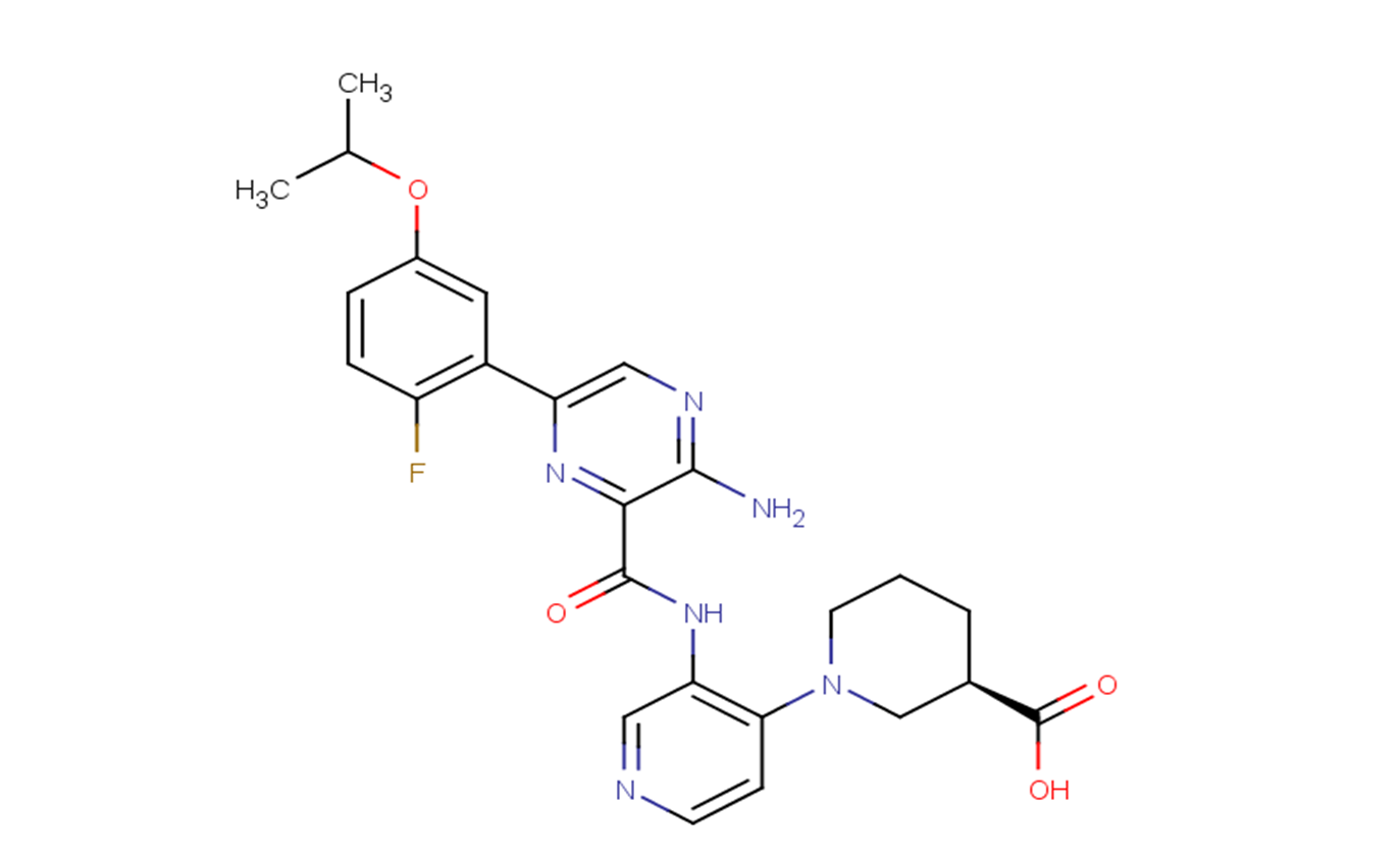 SMILESCC(C)OC1=CC(=C(C=C1)F)C2=CN=C(C(=N2)C(=O)NC3=C(C=CN=C3)N4CCC[C@H](C4)C(=O)O)N