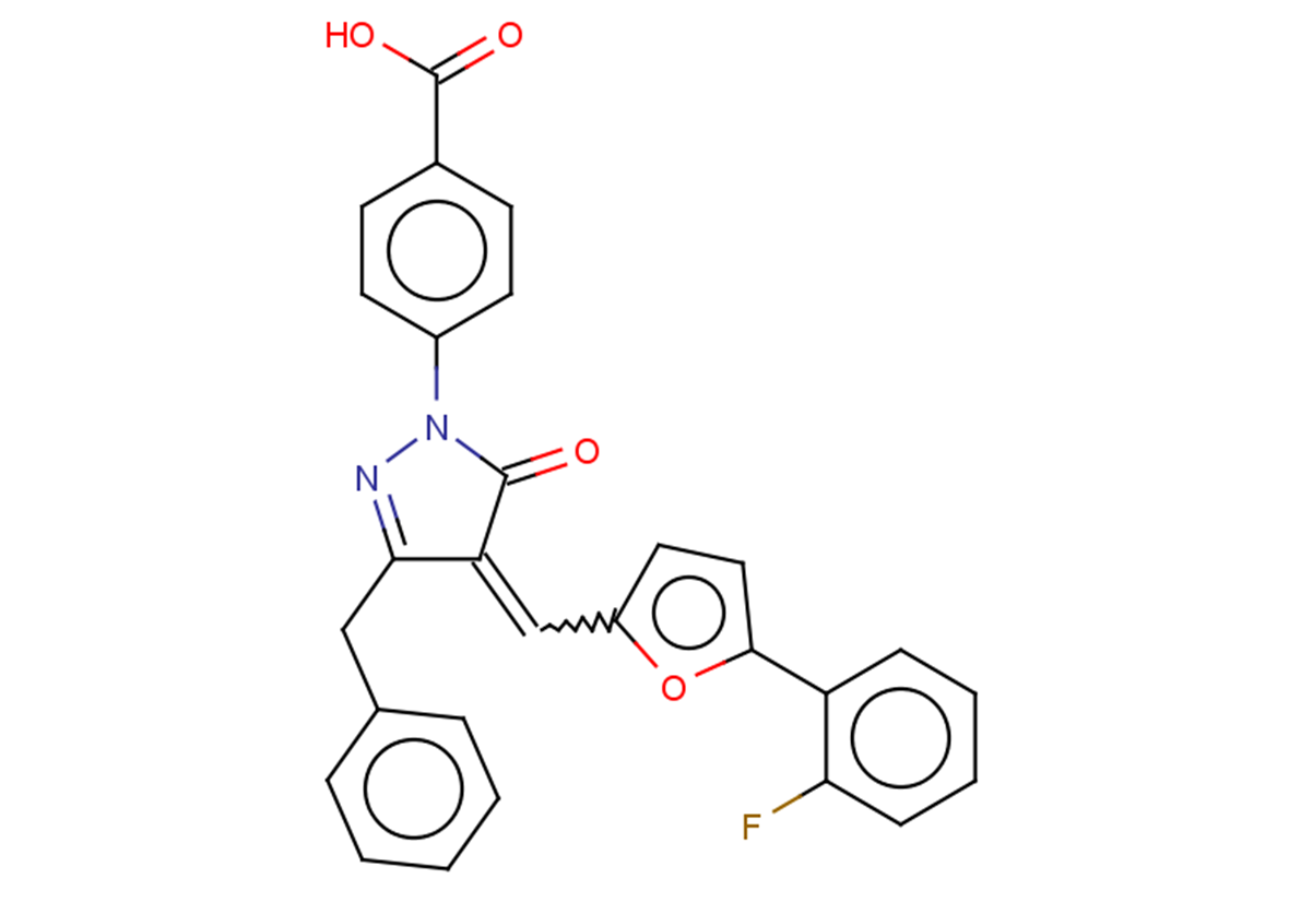 SMILESOC(c(cc1)ccc1N(C1=O)N=C(Cc2ccccc2)C1=Cc1ccc(-c(cccc2)c2F)o1)=O