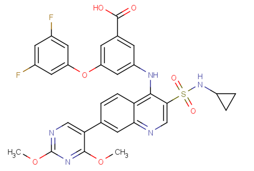 SMILESCOc1ncc(-c2ccc3c(Nc4cc(Oc5cc(F)cc(F)c5)cc(c4)C(O)=O)c(cnc3c2)S(=O)(=O)NC2CC2)c(OC)n1