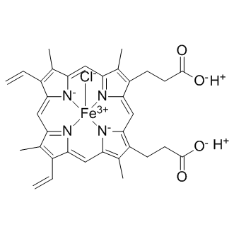 产品描述Hemin, a physiological erythroid maturation stimulator, is able to induce the expression of critical autophagic genes (Map1a1b (LC3), Beclin-1 gen, Atg5) in an erythroleukemia cell type; increases the size of autophagic vacuoles and induces mitophagy in K562 cells; a heme oxygenase (HO)?1 inducer.(In Vitro):Hemin and PGJ2, used as positive controls, strongly increase both expression and activity of HMOX after 4 and 12 h, respectively. Indeed, a significant effect is found of 30 μM Hemin on cell proliferation in all used cell lines after 48 h, which is dose-dependent. Hemin treatment decreases cell proliferation to 62±5 %, 51±3 %, and 38±8 % in PA-TU-8902, BxPC-3 and MiaPaCa-2 cancer cells, respectively, with p<0.0001 for all comparisons. Furthermore, enhancement of anti-proliferative effects of statins is observed by Hemin, documented as decreased cell proliferation after 48 h of co-treatment. (In Vivo):Following the i.p. administration of Hemin (100 μmol/kg), the HO-1 level in the renal cortex begins to increase gradually. The HO-1 level reaches its peak 24 h after Hemin preconditioning. HO-1 is expressed mainly in the renal tubules. The HO-2 level in the kidney does not change following Hemin preconditioning.