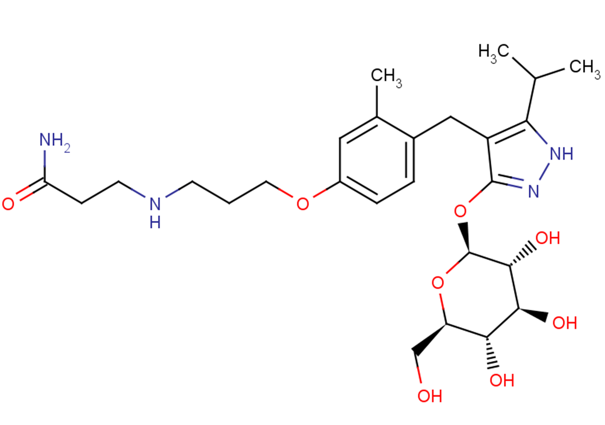 KGA-2727 是一种有效的选择性 SGLT1 抑制剂,对人和大鼠 SGLT1 的 Ki 值分别为 97.4 nM 和 43.5 nM。 KGA-2727 的选择性比(SGLT2 的 Ki/SGLT1 的 Ki)为 140(人)和 390(大鼠)。 KGA-2727用于治疗糖尿病。KGA-2727具有吡唑-O-葡萄糖苷结构,作为第一个选择性SGLT1抑制剂。