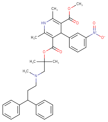 SMILESCC1=C(C(OC)=O)C(C2=CC([N+]([O-])=O)=CC=C2)C(C(OC(C)(CN(CCC(C3=CC=CC=C3)C4=CC=CC=C4)C)C)=O)=C(C)N1