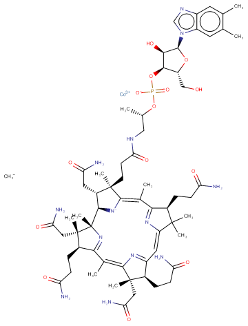 SMILES[CH3-].[Co+3].C[C@@H](CNC(=O)CC[C@]1(C)[C@@H](CC(=O)N)[C@H]2[N-]/C/1=C(/C)\C3=N\C(=C/C4=N\C(=C(\C)/C5=N[C@]2(C)[C@@](C)(CC(=O)N)[C@@H]5CCC(=O)N)\[C@@](C)(CC(=O)N)[C@@H]4CCC(=O)N)\C(C)(C)[C@@H]3CCC(=O)N)OP(=O)([O-])O[C@H]6[C@@H](O)[C@H](O[C@@H]6CO)n7cnc8cc(C)c(C)cc78