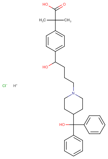 SMILES[H+].[Cl-].CC(C)(C(O)=O)C1=CC=C(C=C1)C(O)CCCN1CCC(CC1)C(O)(C1=CC=CC=C1)C1=CC=CC=C1