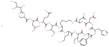 SMILES[Zn].CCC(C)C(N)C1=NC(CS1)C(=O)NC(CC(C)C)C(=O)NC(CCC(O)=O)C(=O)NC(C(C)CC)C(=O)NC1CCCCNC(=O)C(CC(N)=O)NC(=O)C(CC(O)=O)NC(=O)C(CC2C=NC=N2)NC(=O)C(CC2=CC=CC=C2)NC(=O)C(NC(=O)C(CCCN)NC1=O)C(C)CC
