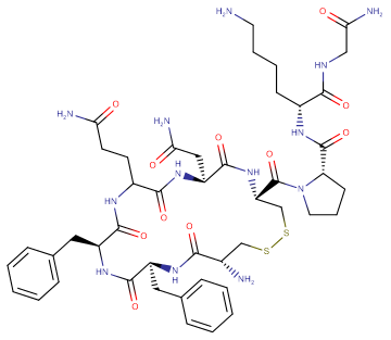 SMILESC1C[C@H](N(C1)C(=O)[C@@H]2CSSC[C@@H](C(=O)N[C@H](C(=O)N[C@H](C(=O)NC(C(=O)N[C@H](C(=O)N2)CC(=O)N)CCC(=O)N)CC3=CC=CC=C3)CC4=CC=CC=C4)N)C(=O)N[C@H](CCCCN)C(=O)NCC(=O)N