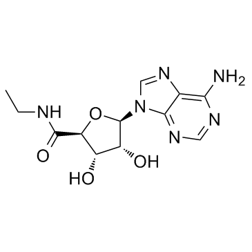 体内实验After the administration of 5'-N-Ethylcarboxamidoadenosine (NECA), the mean number of cocaine infusions obtained per session is decreased significantly in a dose-dependent manner [5'-N-Ethylcarboxamidoadenosine (NECA): F(4,12)=14.9; P<0.001]. The administration of 5'-N-Ethylcarboxamidoadenosine (NECA) [F(4,12)=16.1; P<0.001] results in a significant increase in latencies above values obtained for vehicle treatment. Daily i.p. injection of 5'-N-Ethylcarboxamidoadenosine (NECA) at 0.3 mg/kg/day for two weeks reduces malondialdehyde (MDA) levels in diabetic rats, but does not affect control rats. Daily treatment with NECA (0.3 mg/kg/day, i.p. for two weeks) reduces diabetes-induced gene expression of tumor necrosis factor (TNF)-α and interleukin (IL)-18 in diabetic rats, but does not affect control rats. Daily i.p. injection of 5'-N-Ethylcarboxamidoadenosine (NECA) at 0.3 mg/kg/day for two weeks also blocks the activation of JNK MAPK in diabetic rats, but does not affect control rats.