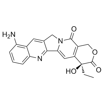 体外实验In human breast (MCF-7), bladder (MGH-U1), and colon (HT-29) cancer cell lines, 9-Aminocamptothecin cytotoxicity increases with both higher drug concentrations and longer exposure times. Minimal cell killing is also observed unless 9-Aminocamptothecin concentrations exceeds a threshold of 2.7 nm. 9-Aminocamptothecin inhibits PC-3, PC-3M, DU145, and LNCaP cells with IC50 values of 34.1, 10, 6.5, and 8.9 nM, respectively after 96 h of drug exposure.