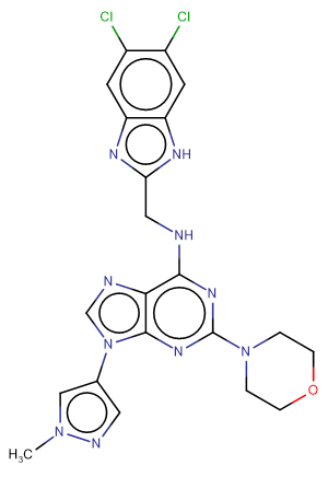 SMILESCn1cc(cn1)-n1cnc2c(NCc3nc4cc(Cl)c(Cl)cc4[nH]3)nc(nc12)N1CCOCC1