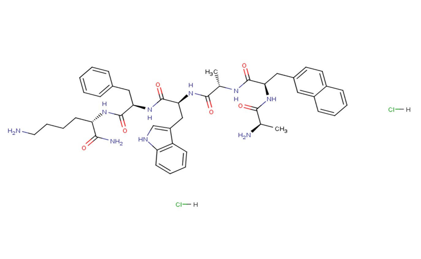 SMILESNCCCC[C@@H](C(N)=O)NC([C@@H](CC1=CC=CC=C1)NC([C@H](CC2=CNC3=C2C=CC=C3)NC([C@H](C)NC([C@@H](CC4=CC=C5C=CC=CC5=C4)NC([C@@H](C)N)=O)=O)=O)=O)=O.[H]Cl.[H]Cl