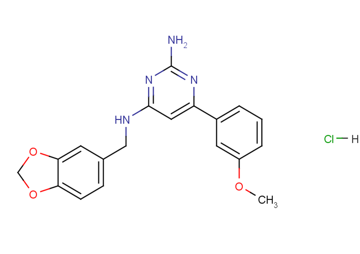 SMILESNC1=NC(C2=CC=CC(OC)=C2)=CC(NCC3=CC=C(OCO4)C4=C3)=N1.[H]Cl