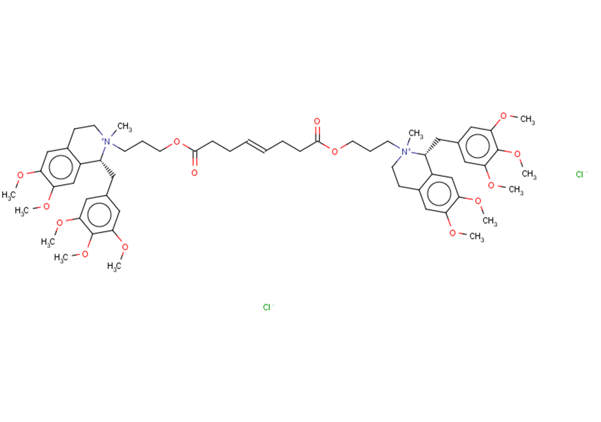 产品描述Mivacurium chloride is a non-depolarising, rapid neuromuscular blocker of short duration, used therefore as anesthetic, to provide skeletal muscle relaxation in minor surgical operations, in emergency surgical procedures of short to intermediate duration and during intubation of the trachea.(In Vitro):Mivacurium induces LAD2 cell degranulation in a dose-dependent manner. Mivacurium stimulates intracellular Ca2+ influx in MRGPRX2-HEK293 cells but not in NC-HEK293 cells. Mivacurium induces the release of only low levels of mediators in LAD2 cells transfected with MRGPRX2-targeted small interfering siRNA.(In Vivo):Mivacurium causes pseudo-allergic reactions in C57 wild-type mice by inducing mast cells to release histamine and a decrease in body temperature.Mivacurium is rapidly hydrolyzed in the plasma and has a short duration of action (< 10 min). Mivacurium has many advantages, such as a rapid effect, nonneurological toxicity and a lack of heart rate alteration.