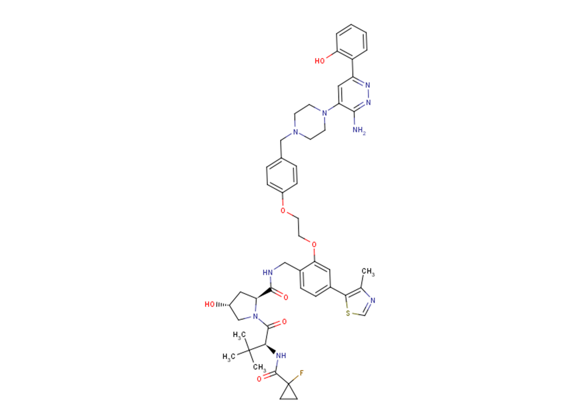 SMILESCC(N=CS1)=C1C2=CC=C(CNC([C@@H]3C[C@@H](O)CN3C([C@H](C(C)(C)C)NC(C4(CC4)F)=O)=O)=O)C(OCCOC5=CC=C(CN6CCN(C7=CC(C8=C(O)C=CC=C8)=NN=C7N)CC6)C=C5)=C2