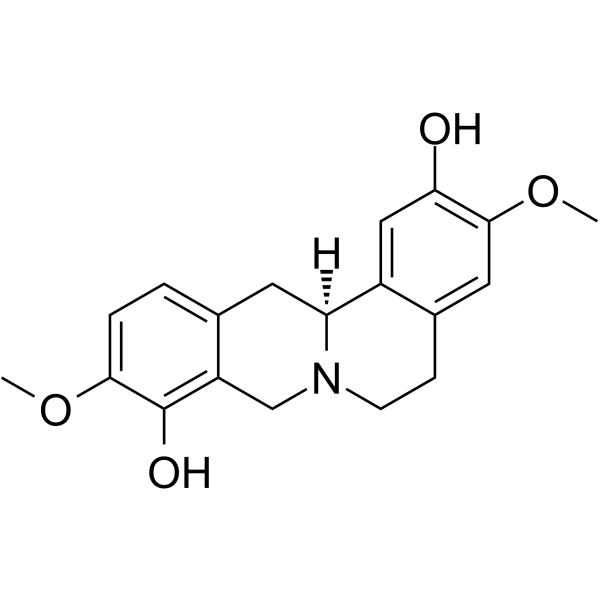 体外实验Scoulerine ((-)-Scoulerine) inhibits mini-panel of human leukemic cells, MOLT-4 (WT), Jurkat (TP53 mutated), Raji (TP53 mutated), HL-60 (TP53 null), U-937 (TP53 mutated), and HEL 92.1.7 (wild-type), with IC50s ranging from 2.7?μM to 6.5?μM.Scoulerine (2.5-20?μM; 24 hours) decreases proliferation of Jurkat and MOLT-4 cells.Scoulerine (2.5-20?μM; 24 hours) induces MOLT-4 and Jurkat cells apoptosis.Scoulerine induces G2 or M cell cycle arrest.Scoulerine (2.5-5?μM; 24?hours) shows an upregulation of p53 protein in p53 wild-type MOLT-4 cells.Scoulerine (2.5-5?μM; 24-48 hours) activates caspase-3/7, -8 and -9 in a dose-dependent manner.Scoulerine (5-10 μM; 24 hours) disrupts microtubule structure of A549 lung carcinoma cells .Cell Proliferation Assay Cell Line:Jurkat and MOLT-4 cellsConcentration:2.5, 5, 10, 15 and 20?μM Incubation Time:24?hours Result:Significantly reduced the viability and proliferation of Jurkat and MOLT-4 cells in a dose dependent manner.Apoptosis Analysis Cell Line:MOLT-4 and Jurkat cells Concentration:2.5, 5, 10, 15 and 20?μM Incubation Time:24 hours Result:Induced MOLT-4 and Jurkat cells apoptosis.Cell Cycle Analysis Cell Line:Jurkat and MOLT-4 leukemic cells Concentration:2.5-20 μM Incubation Time:16 hours Result:Induced cell cycle arrest at the G2/M transition.Western Blot Analysis Cell Line:MOLT-4 cells Concentration:2.5, 5?μM Incubation Time:24?hours Result:Showed an upregulation of p53 protein in p53 wild-type MOLT-4 cells.
