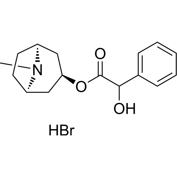 体外实验Homatropine (20 μM) alone produces a dose ratio of 259 in atrium from guinea-pigs, and produces a dose ratio of only 95.0 when combined with Hexamethonium Bromide (HY-B0569) in atrium from guinea-pigs.Homatropine has affinities for muscarinic receptors in stomach (pA2 = 7.13) and for those in atria mediating force (pA2 = 7.21) and rate (pA2 = 7.07) responses.