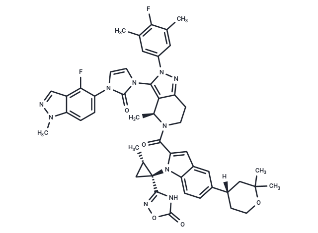 SMILES[H][C@@]1(CCOC(C)(C)C1)c1ccc2n(c(cc2c1)C(=O)N1CCc2nn(c(c2[C@@H]1C)-n1ccn(-c2ccc3n(C)ncc3c2F)c1=O)-c1cc(C)c(F)c(C)c1)[C@]1(C[C@@H]1C)c1noc(=O)[nH]1