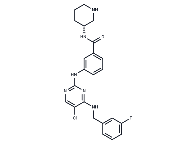 SMILESN(C=1N=C(NCC2=CC(F)=CC=C2)C(Cl)=CN1)C3=CC(C(N[C@@H]4CCCNC4)=O)=CC=C3