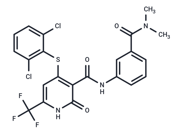 SMILESS(C1=C(C(NC2=CC(C(N(C)C)=O)=CC=C2)=O)C(=O)NC(C(F)(F)F)=C1)C3=C(Cl)C=CC=C3Cl