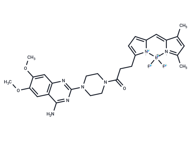 体外实验BODIPY FL prazosin (10 nM; 30 min at room temperature in 100 μl; COS-7 cells) shows Affinity of various α1-AR ligands with Ki values of 14.5, 43.3 nM for α1a-AR and α1b-AR, respectively.BODIPY FL prazosin (100 nM, 30 min) can be used as molecular probe for the Visualization of the non-adrenoceptor binding site of α1-adrenergic drugs in erythroleukemia cells.