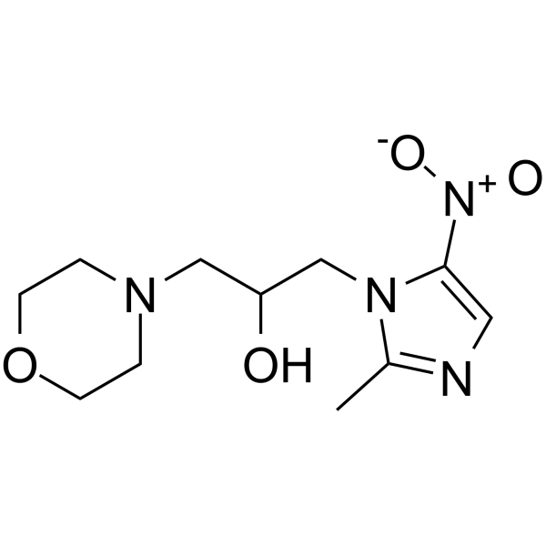 体外实验Morinidazole can be metabolized to N+-glucuronide of S-morinidazole [M8-1] and N+-glucuronide of R-morinidazole [M8-2] via N+-glucuronidation, and sulfate conjugate of morinidazole [M7] via sulfation.M7 is a substrate for organic anion transporter 1 (OAT1) and OAT3 (Km=28.6 and 54.0 μM, respectively), M8-1 and M8-2 are the substrates for OAT3.Morinidazole shows activity against Trichomonas vaginalis and Entamoeba histolytica in vitro, with MIC values of 2 μg/mL and 3 μg/mL, respectively.