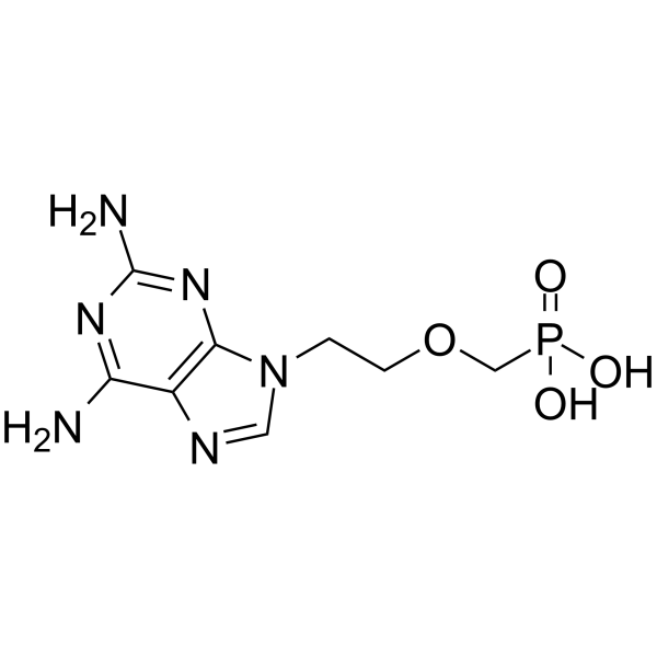 体内实验PMEDAP (0.25-5 mg/kg; IP; daily; starting on the day of MSV-infected and continuing for an additional four days) causes a dose-dependent suppression of tumor formation and mortality in newborn mice inoculated with MSV. Animal Model:Three-week-old male NMRI mice Dosage:0.25 mg/kg, 1 mg/kg, 5 mg/kg Administration:IP; daily; starting on the day of infection and continuing for an additional four days Result:Effected a significant delay in tumor appearance and an enhancement of the survival rate of tumor-bearing mice.