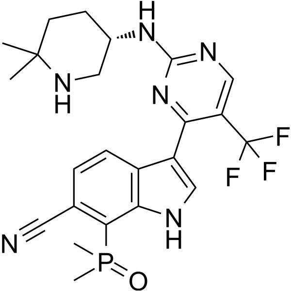 体外实验SY-5609 (0.01-10000 nM; 72 hours) demonstrates strong antiproliferative effects in triple negative breast cancer (TNBC) and ovarian (OVA) cancer cells. SY-5609 (100-500 nM; 48, 72 hours) induces apoptosis.SY-5609 (100-500 nM; 48 hours) induces G2/M cell cycle arrest in HCC70 cells. SY-5609 (25-500 nM; 6-48 hours) results in inhibition of the phosphorylation of CDK2 at Thr160 via loss of CAK function for 24 and 48 h. SY-5609 (compound 101; 126.4 pM-4 μM; 72 hours) has an EC50 of 5.6 nM in HCC70 cell line.Cell Proliferation Assay Cell Line:HCC70, MDA-MB453, COV504, A2780, OVCAR3, CAOV3 cells Concentration:0.01-10000 nM Incubation Time:72 hours Result:Demonstrated strong antiproliferative effects with IC50 of 1-6 nM.Apoptosis Analysis Cell Line:HCC70, MDA-MB-468, CAOV3 and OVCAR3 cells Concentration:100, 250, 500 nM Incubation Time:48 and 72 hours Result:Induced apoptosis.Cell Cycle Analysis Cell Line:HCC70 cells Concentration:100, 250, 500 nM Incubation Time:48 hours Result:Induced G2/M cell cycle arrest.Western Blot Analysis Cell Line:HCC70 cells Concentration:25, 50, 100, 250, 500 nM Incubation Time:6, 24, 48 hours Result:Resulted in inhibition of the phosphorylation of CDK2 at Thr160 via loss of CAK function for 24 and 48 h.