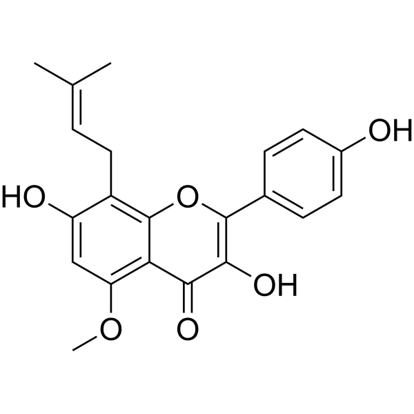 体外实验Sophoflavescenol shows cytotoxicity against human leukaemia (HL-60), Lewis lung carcinoma (LLC), and human lung adenocarcinoma epithelial (A549) cells. Sophoflavescenol exerts notable anti-inflammatory activity by inhibiting nitric oxide generation and tert-butylhydroperoxide-induced ROS generation rather than inhibiting nuclear factor kappa B activation in RAW 264.7 cells. Sophoflavescenol exhibits remarkable inhibition of RLAR activity with an IC50 value of 0.30 μM, compared with 0.07 μM for epalrestat, a well known ARI. Sophoflavescenol also shows potent inhibitory activity with an IC50 value of 0.17 μM, comparable to epalrestat (0.15 μM) in the HRAR assay. In the AGE assay, sophoflavescenol (IC50 17.89 μg/mL) is a more potent inhibitor of AGE formation than aminoguanidine (IC50 81.05 μg/mL). Sophoflavescenol exerts both potent AChE and BChE inhibitory effects with respective IC50 values of 8.37 and 8.21 μM. Sophoflavescenol also exhibits good BACE1 inhibition in a dose-dependent manner with an IC50 value of 10.98 μM. Sophoflavescenol is a mixed inhibitor (Ki=0.005 μM) against cGMP PDE5. Sophoflavescenol shows greatest selectivity toward PDE5, 31.5- and 196.2-fold over PDE3 and PDE4, respectively.
