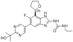 化学全称N-Ethyl-N'-[6-fluoro-5-[2-(1-hydroxy-1-methylethyl)-5-pyrimidinyl]-7-[(2R)-tetrahydro-2-furanyl]-1H-benzimidazol-2-yl]urea